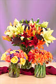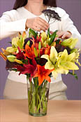 Concentrate on one type of flower, such as lilies, in a variety of fall colors to create a main bouquet. Accent with a complementary color, such as purple trachelium.