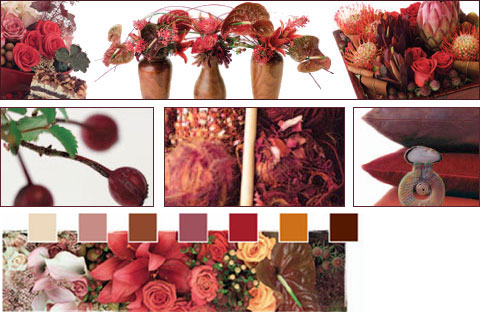 Texture drives design style in these close colors. Some flowers that support the look and feel are 'Moreno' and 'Gypsy Curiosa' Roses, Orange Lilies, 'Choco' and Red Anthuriums, Leucadendrons, Leucospermums, Kangaroo Paws, Celosia, Hypericum and Epidendron Orchids.