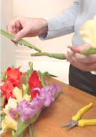 Trim 2 to 3 inches off the bottom of each stem using a floral knife. Cut underwater to increase flower life. Trim at an angle to keep the stems base from resting on the bottom of the vase, which impedes water uptake.