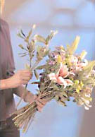 Use a crisscross motion to create your bouquet. Build the bouquet as follows: Begin with one stem of Stargazer lily. Then, add tow stems of phlox, one on each side of the lily. Next, add two stems of bupleurum between each stem of phlox. Then evenly add four stems of waxflower.