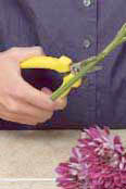 Cut at least a half-inch off each stem using a sharp knife or scissors. Cut at an angle so stems touching the container still can draw water. Place the flowers in the vase and arrange as desired.