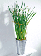 Designs that are fragrant, simple, bountiful and earthy are key elements. Strands of rye grass in white or blue-washed pots tied with a French ribbon are simple and graceful decor for a serving counter or sideboard. Galvanized metal buckets can hold plants or flowers.