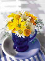 For a lively centerpiece, try mixing colorful gerbera daisies in Mexican "bubble" glass or painted pottery. Make a flower punch float for the Sangria bowl using a mixture of bright blooms. Suspend or display piñatas that have been opened on the top and have flowers arranged inside. Place flower arrangements or plants in sombreros for a table piece.