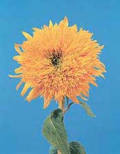 Teddy Bear is another novel variety. It is a dwarf, fully double sunflower with a profusion of orange petals that gives it a somewhat fuzzy appearance.