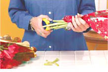 Fill a large container with water and flower food. Resist your first impulse to remove the plastic sleeves in which your tulips are encased. Leave them on and follow these steps to strengthen your tulip stems. While still sheathed in the plastic, trim off the bottom half-inch of each stem.